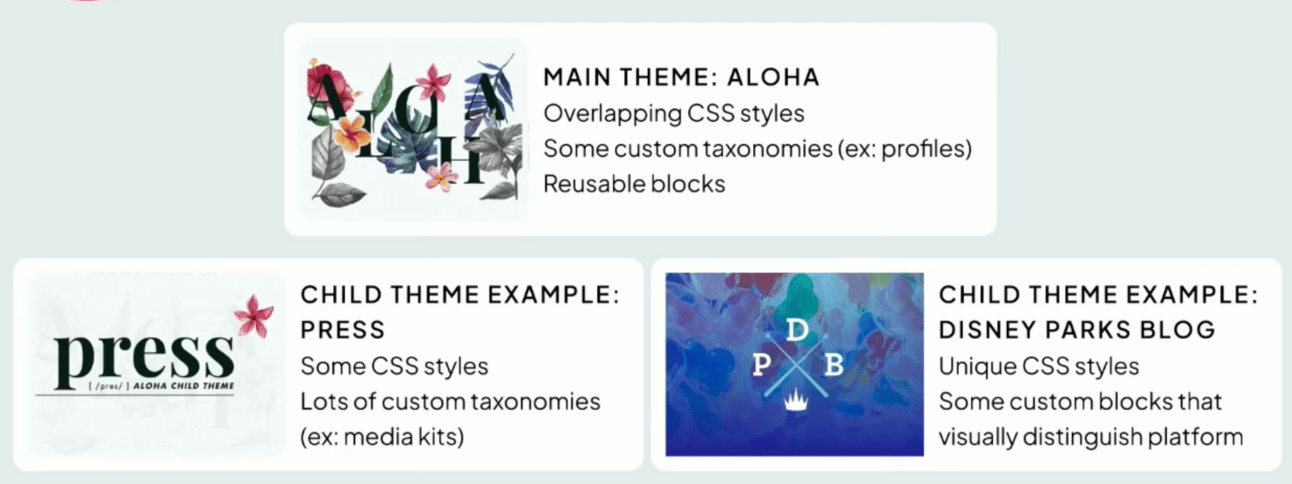 Aloha is pretty versatile. It uses child themes to tailor each site according to its specific needs—whether it's the Disney Parks Blog, internal communications, documentation, or press releases—while keeping everything snugly within Disney's overall design framework.