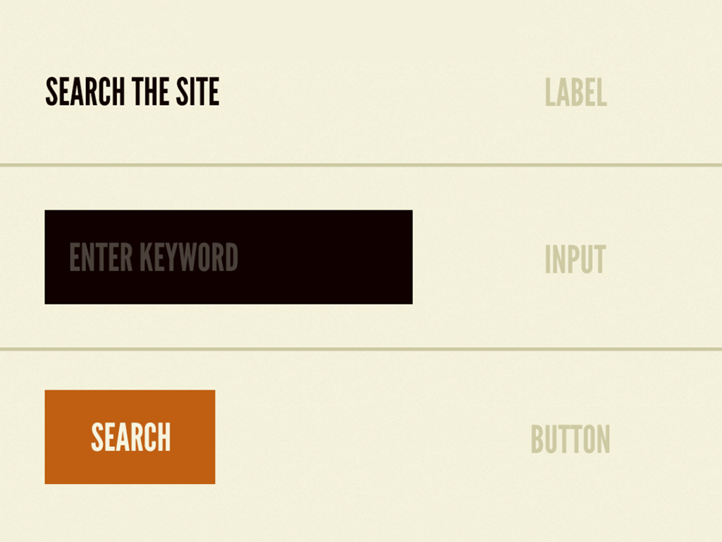 Molecules combine atoms into simple groups. Search form = label + input + button. Card = heading + image + text snippet.