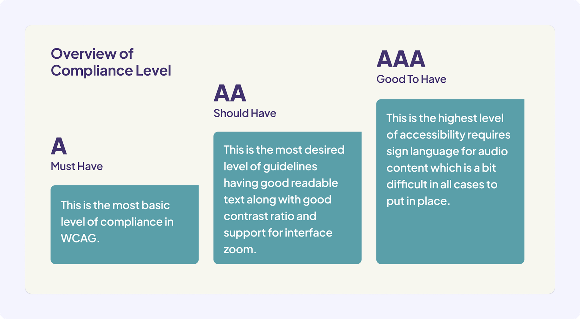Web Content Accessibility Guidelines (WCAG) provide three conformance levels: